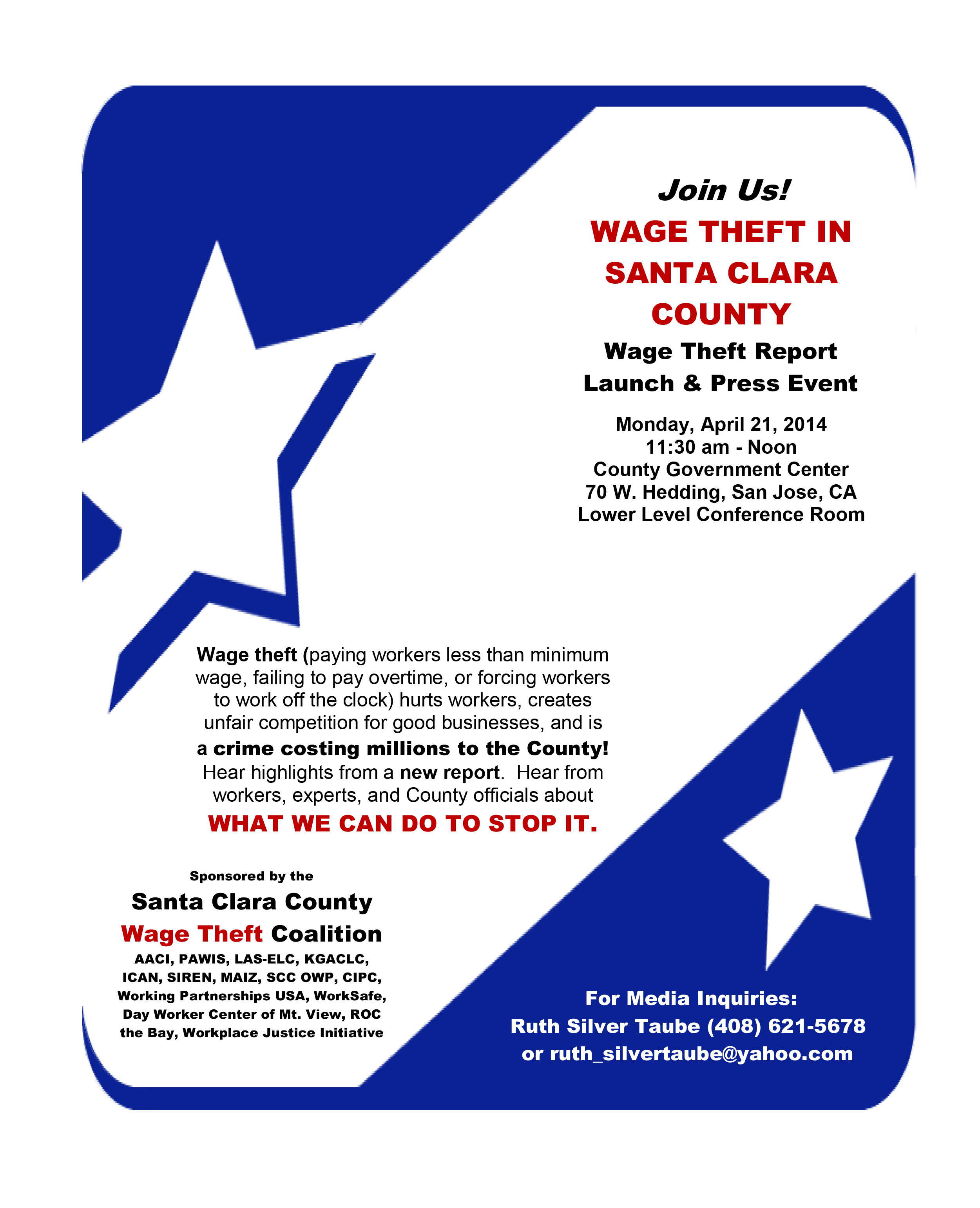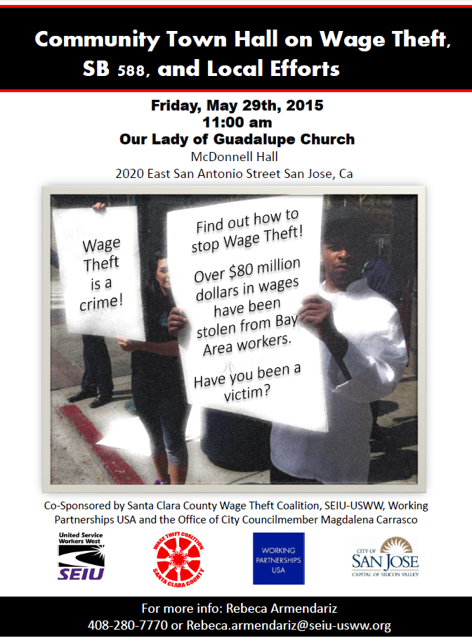 Co-Sponsored by Santa Clara County Wage Theft Coalition, SEIU-USWW, Working Partnerships USA and the Office of City Councilmember Magdalena Carrasco
